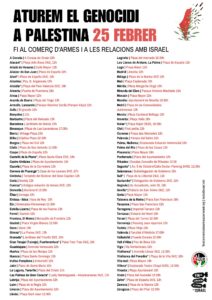 Nova jornada de mobilització en diferents ciutats de l’Estat espanyol aquest diumenge 25 de febrer per exigir la fi del comerç d’armes i de les relacions amb Israel #AmbPalestina25. El principal objectiu és demanar al Govern d’Espanya que deixi de mentir, enviar i comprar armes a l’estat d’Israel, armes amb les quals l’exèrcit sionista comet genocidi contra el poble palestí. N’hi ha prou de complicitat dels governs i les empreses. Els carrers i el boicot són les eines perquè el Govern de coalició prengui mesures contundents i les empreses deixin de patrocinar el bombardeig constant que sofreix Gaza.