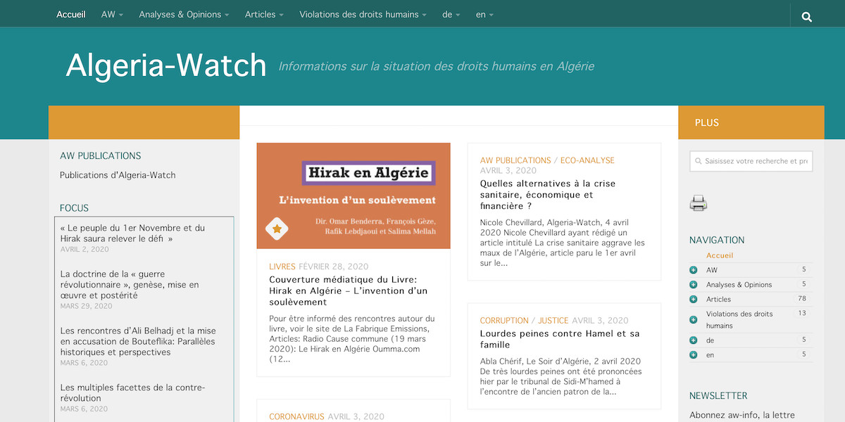 Algeria-Watch est une association de défense des droits humains en Algérie. Créée en 1997 en Allemagne, elle a rapidement dépassé le cadre germanophone et développé des activités en langue française. Depuis janvier 2002, elle existe également en France, où elle a constitué une association (loi de 1901) du même nom. Toutes les activités d’Algeria-Watch sont […]