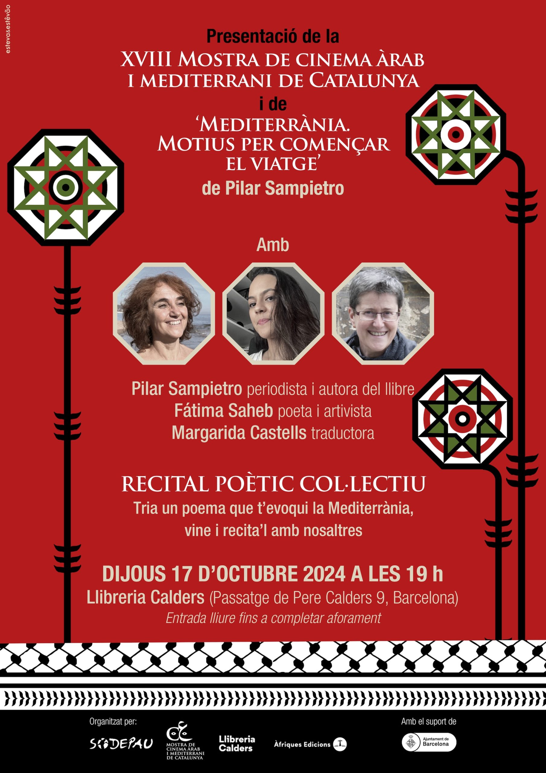 La Mostra de Cinema Àrab i Mediterrani de Catalunya donarà a conèixer la programació de la seva divuitena edició el 17 d’octubre a les 19h a la Llibreria Calders, en un acte en el qual també es presentarà del nou llibre de Pilar Sampietro, Mediterrània. Motius per començar el viatge’ i hi haurà un recital poètic col·lectiu.