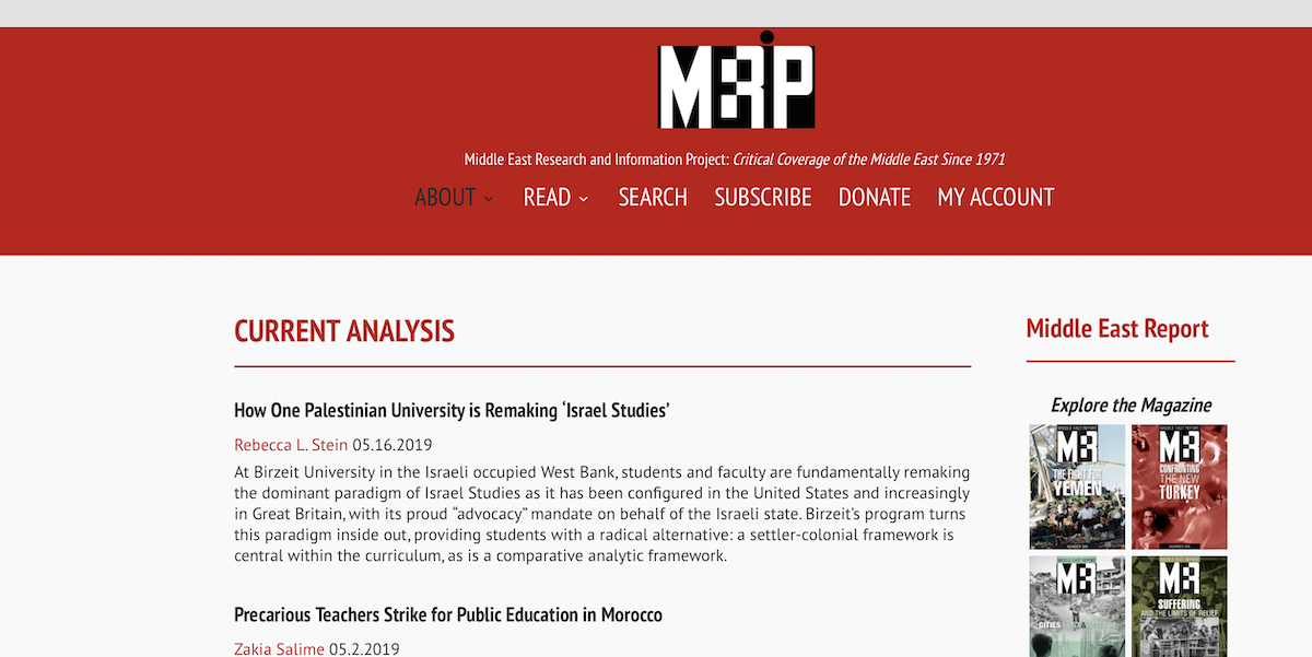 Independent and progressive in orientation, MERIP provides critical, alternative reporting and analysis, focusing on state power, political economy and social hierarchies as well as popular struggles and the role of US policy in the region. MERIP seeks to reach academics, journalists, non-governmental and governmental organizations and informed citizens who want knowledgeable analysis and critical resources about contemporary political developments. Informed by scholarship and research, MERIP is not a peer-reviewed academic journal, but rather a curated platform for critical analysis and discussion that brings informed perspectives to a broader audience.