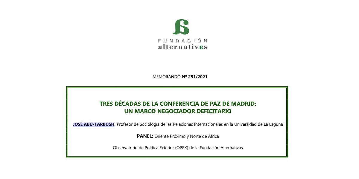 José Abu-Tarbush. Fundación Alternativas [2021] En otoño de 1991 se celebraba en Madrid la Conferencia Internacional de Paz sobre Oriente Próximo. Por primera vez árabes e israelíes se sentaban en torno a una mesa de negociación después de varias décadas desde la implantación del Estado israelí en unas tres cuartas partes del territorio palestino en […]