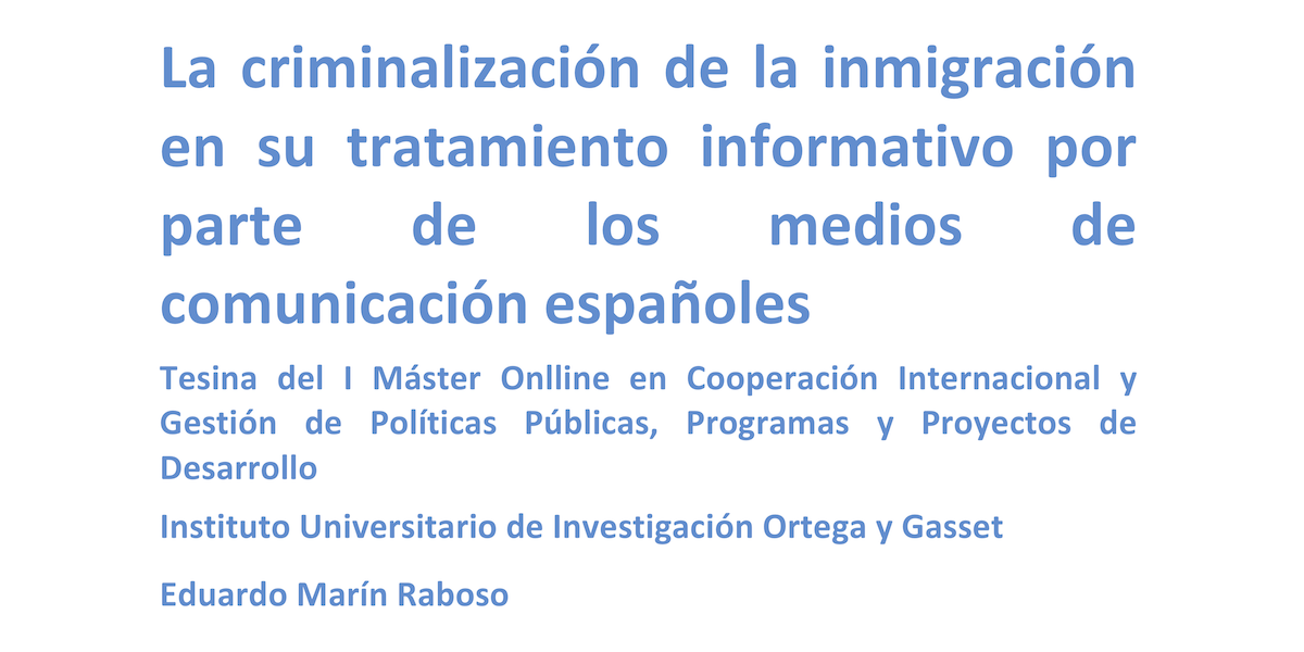 Tesina de Eduardo Marín Raboso* para el I Máster Online en Cooperación Internacional y Gestión de Políticas Públicas, Programas y Proyectos de Desarrollo del Instituto Universitario de Investigación Ortega y Gasset. Llegir “Uno de los ejemplos más claros concierne a la imagen que se tiene en España de que la mayor parte de la inmigración llega al país de manera irregular. Nada más lejos de la realidad. Según la […]